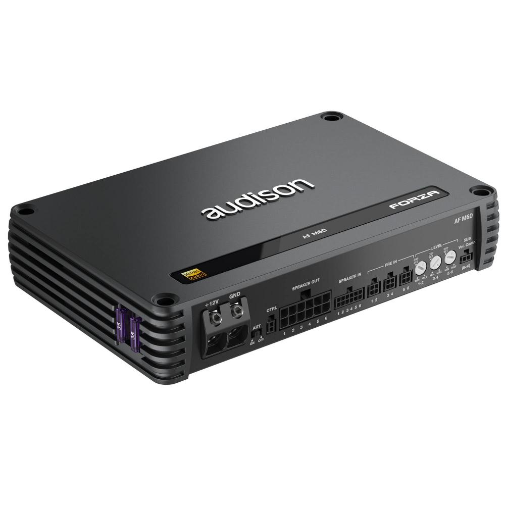 Gli amplificatori AF companion sono progettati per aggiungere potenti canali di amplificazione agli amplificatori per processori di bit AF. È incluso un cablaggio di ingresso del segnale plug-and-play che rende semplice il collegamento agli amplificatori bit AF. Gli amplificatori AF companion sono perfetti anche per l'uso con sistemi controllati e gestiti da un processore di bit indipendente, come un bit One HD Virtuoso. Gli AF companion hanno un'architettura "straight wire", senza funzioni di preamplificazione analogica come il filtraggio crossover, e sono destinati all'uso con processori esterni. AF M6D vanta sei canali amplificati ad alta fedeltà 135W x 6 @4Ω*, 220W x 6 @2Ω*, con il suono audiofilo della tecnologia Audison D-Class di ultima generazione.